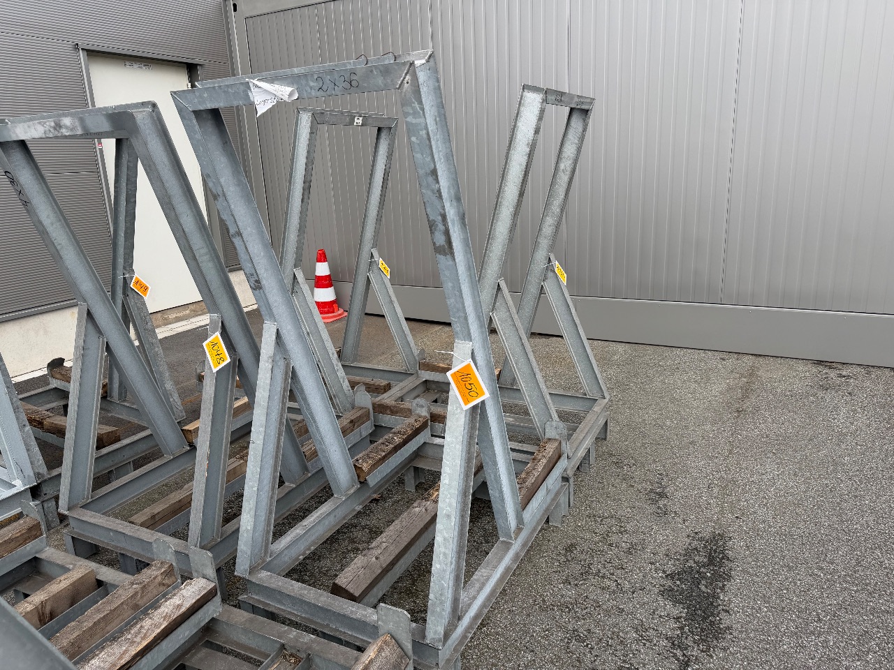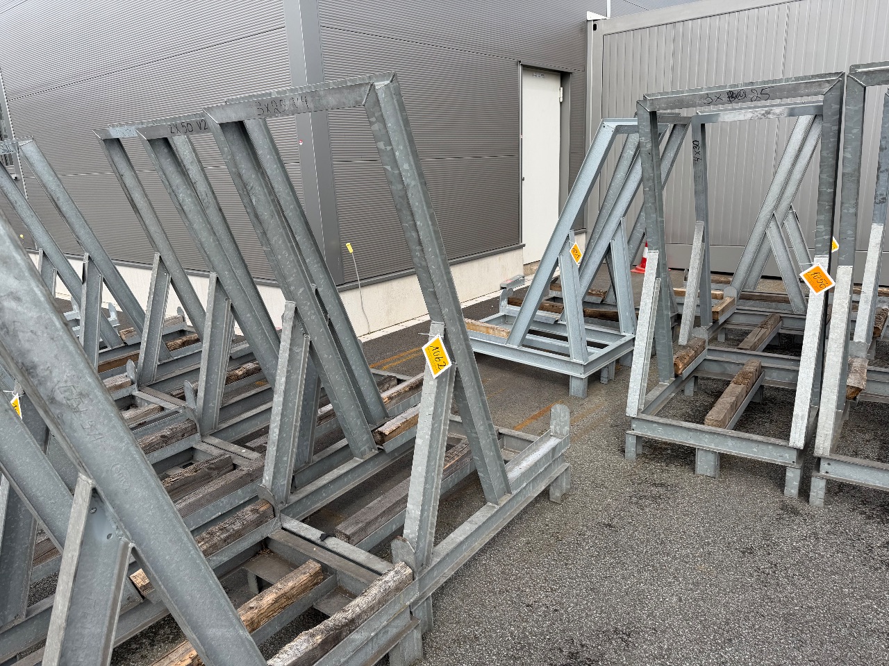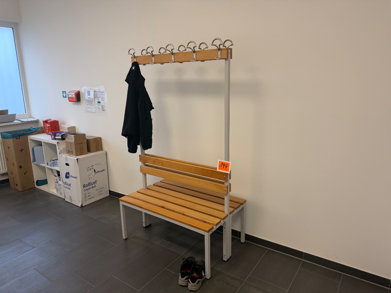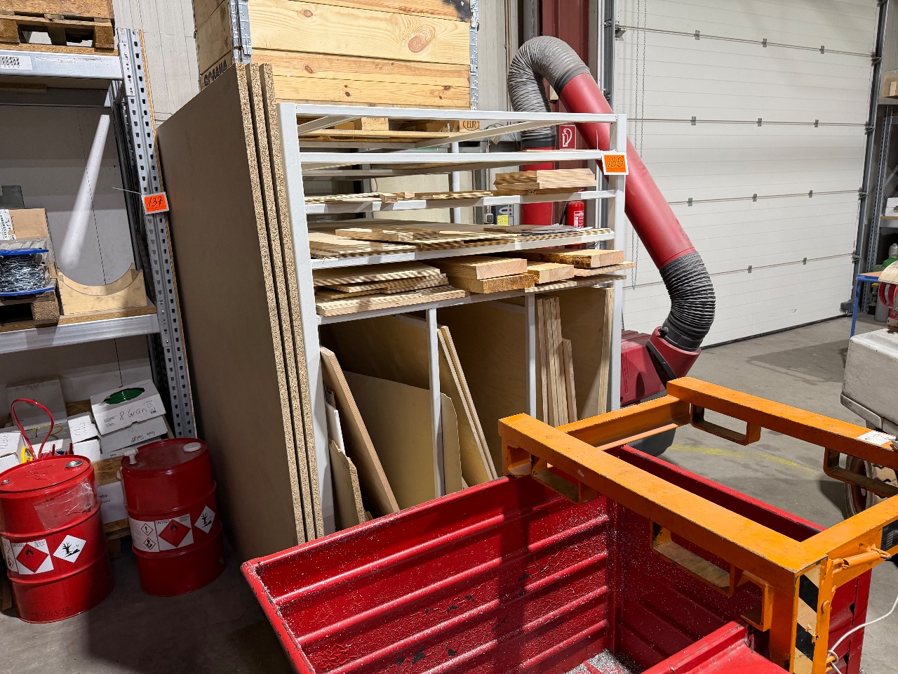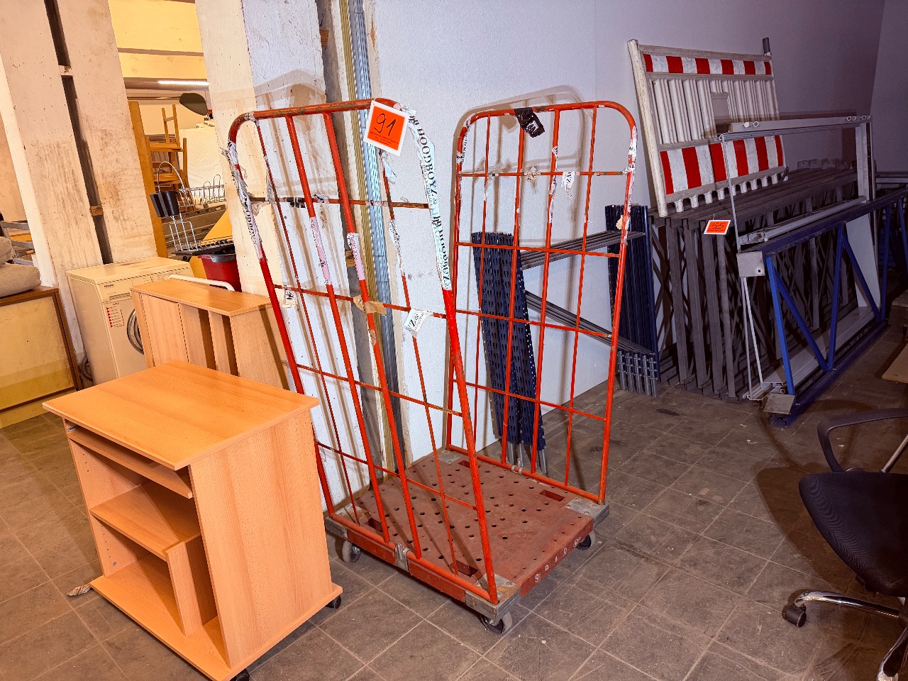 Hänge- und Regalanlage auf Holz-Podest (3) - (Bruynzeel) - (Bj.: 2002) - (Abm.: 610 x 400 x 273 cm) - (je 5 Hängevorrichtungen + 2 Ablageböden)