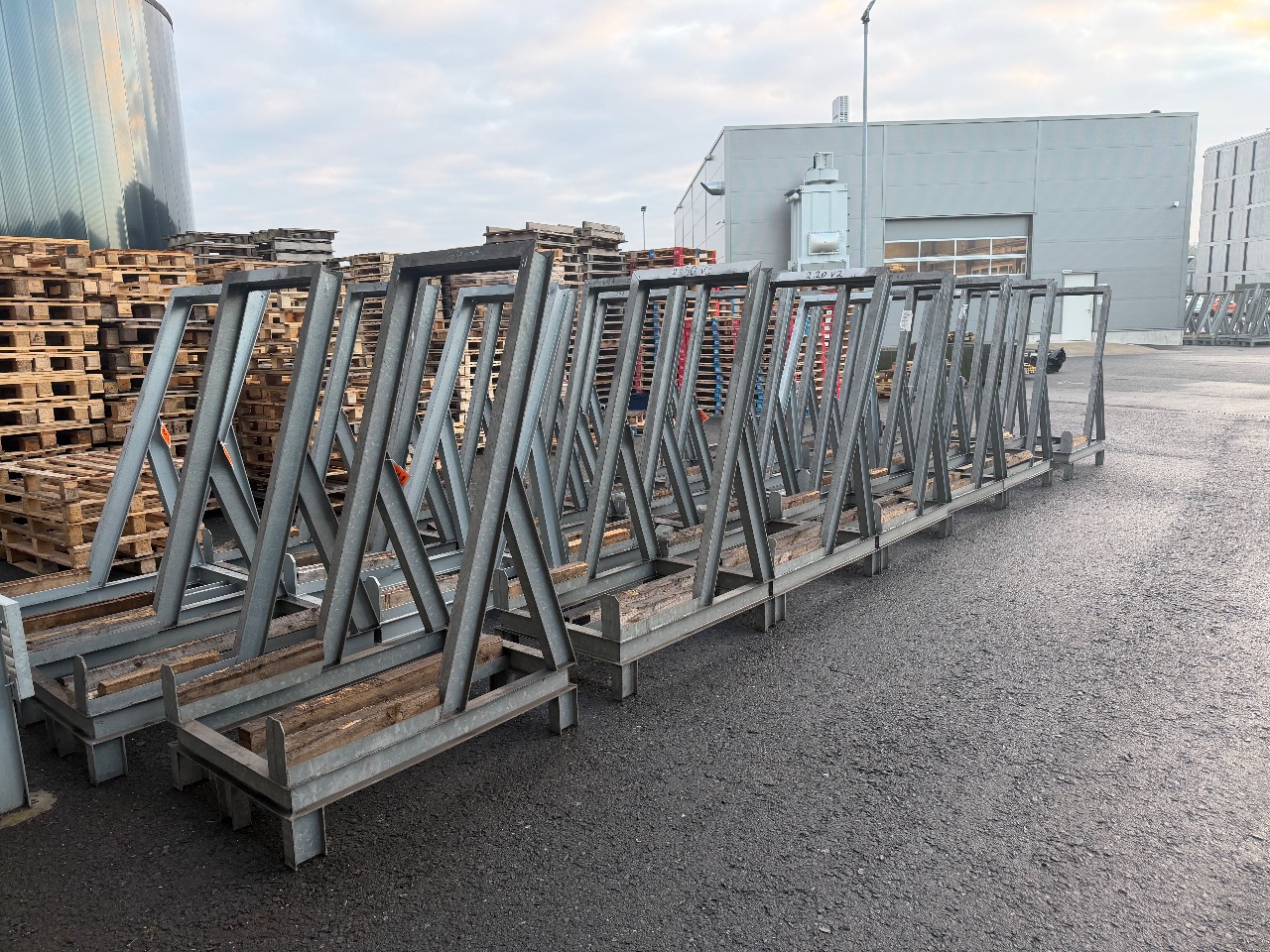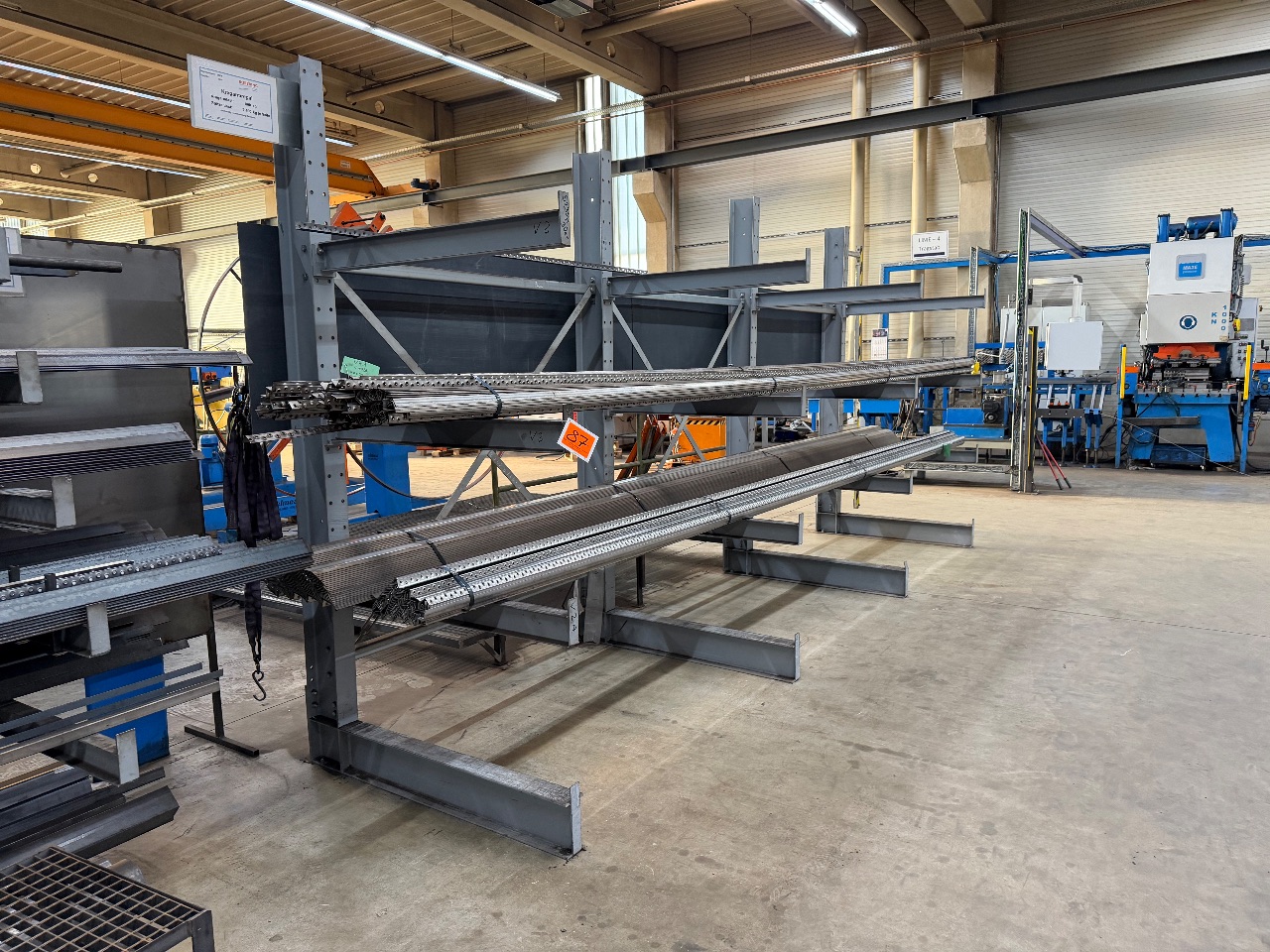 Kragarm-Regal (21 Ständer, je 7 Kragarme = 147 Kragarme) - (Kragarmlänge: je 210 cm) - (Ständerhöhe: 650 cm) - (mit 147 Gitterrost-Ablageträgern) - (Kragarme geschraubt) - (mit Schutzpollern) - (Kragarm-Regale sind demontiert + werden soweit möglich auf P