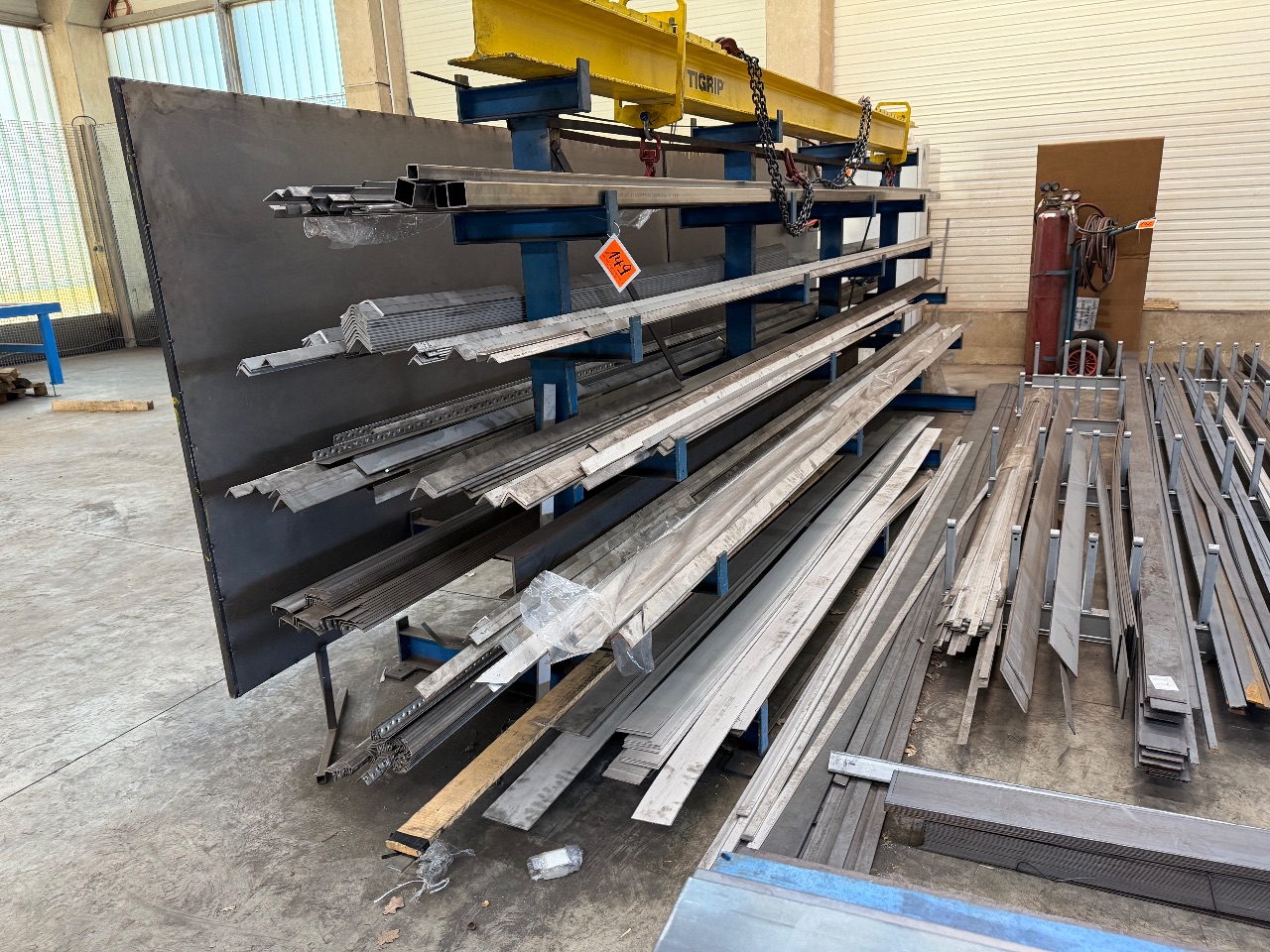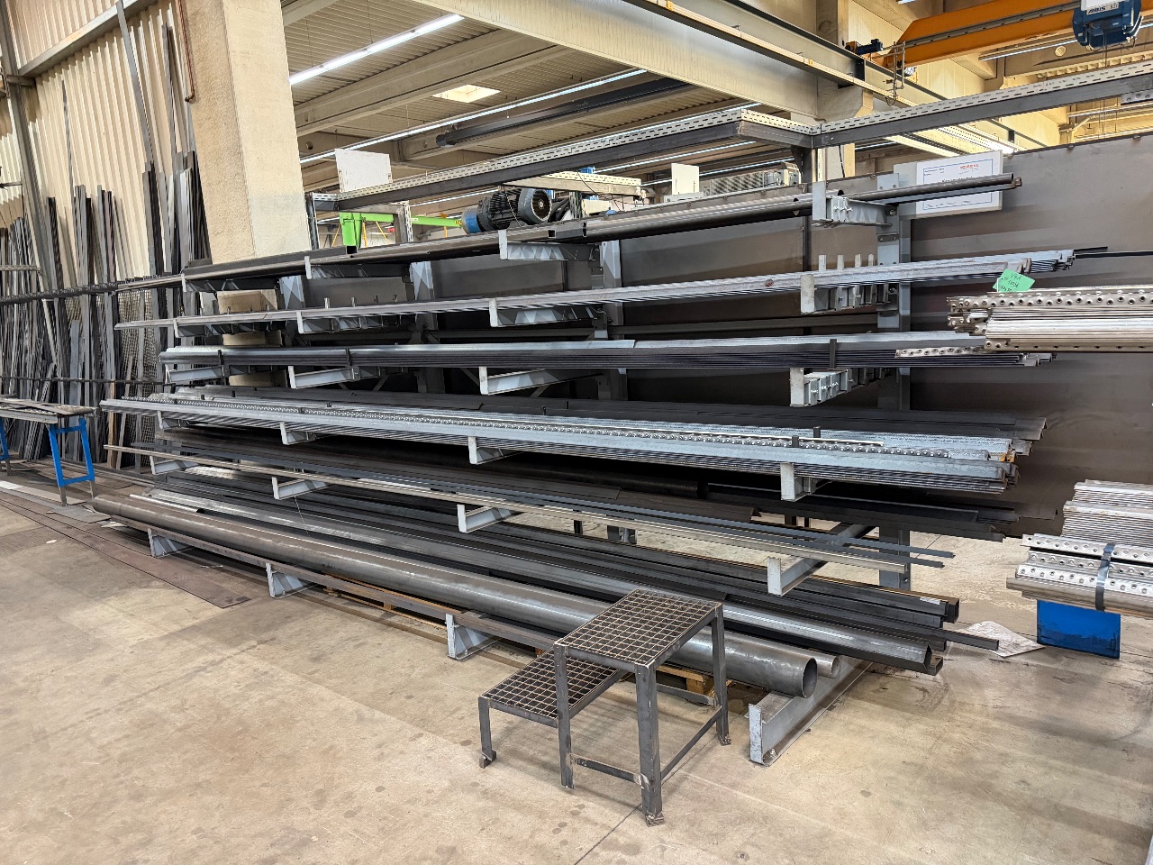 Kragarm-Regal (21 Ständer, je 7 Kragarme = 147 Kragarme) - (Kragarmlänge: je 210 cm) - (Ständerhöhe: 650 cm) - (mit 147 Gitterrost-Ablageträgern) - (Kragarme geschraubt) - (mit Schutzpollern) - (Kragarm-Regale sind demontiert + werden soweit möglich auf P