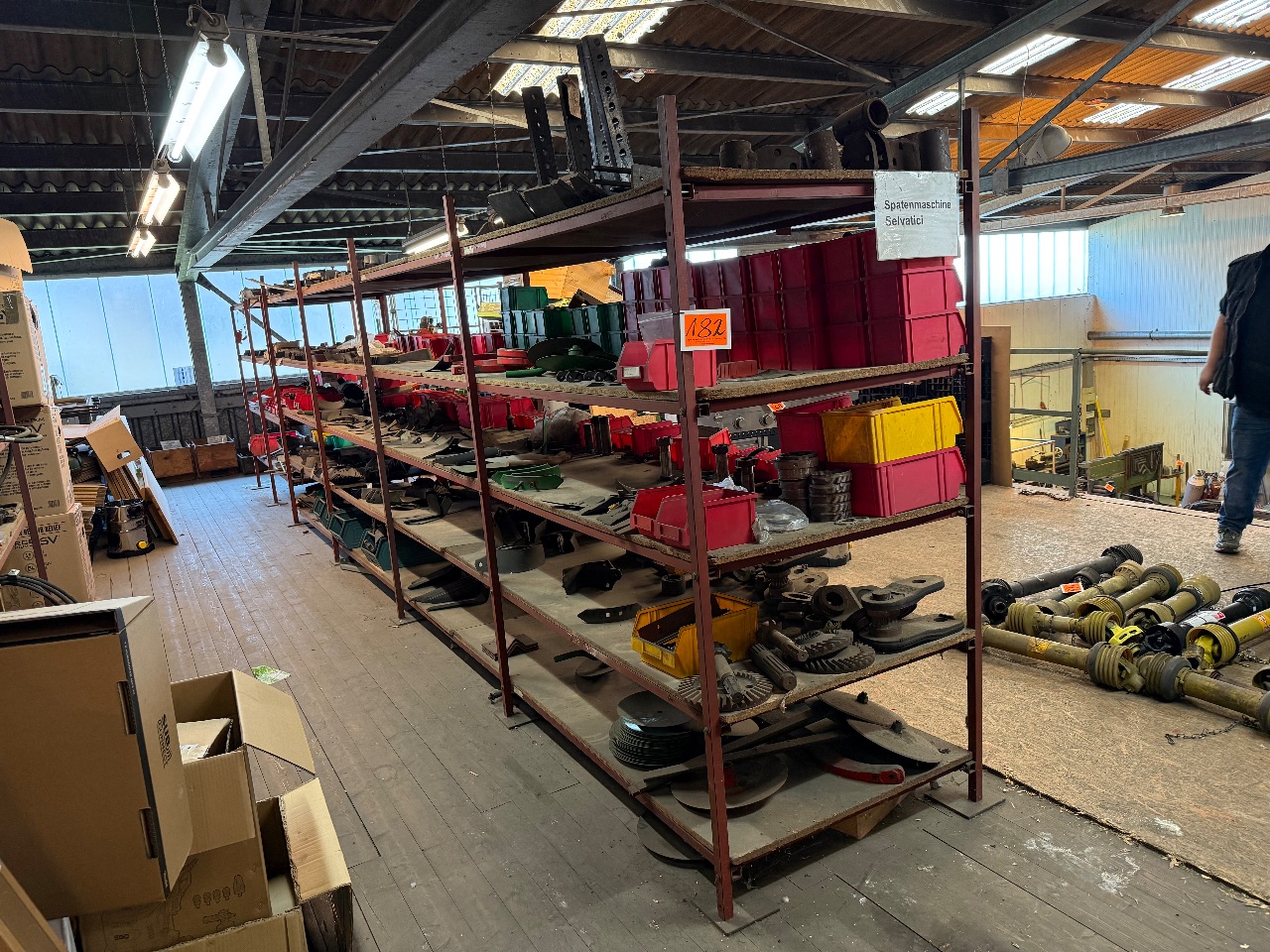 Eisen-Regal (mit Holz-Ablageböden) + (div. Hackscharen + Fräsmessern) + (div. Ersatzteilen Spatenmaschinen - (Gramegna, Falc + Selvatici))