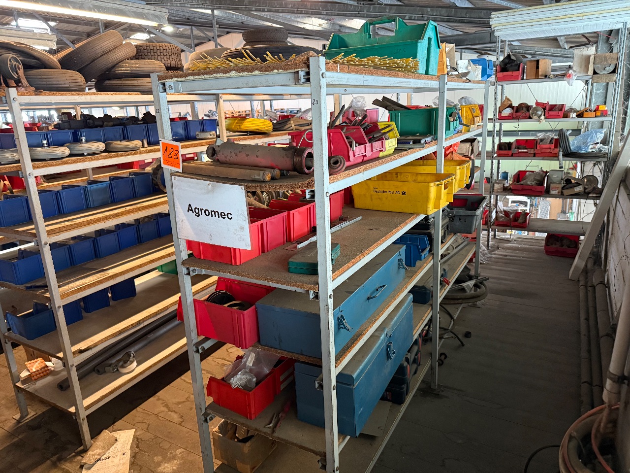 Eisen-Regal (mit Holz-Ablageböden) + (div. Ersatzteilen Agromec) - (div. Werkzeuge, Motoren etc.)