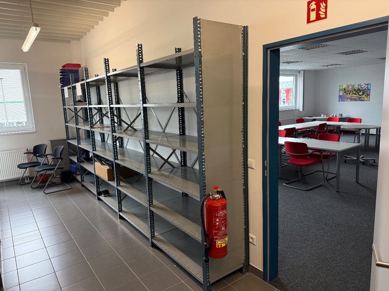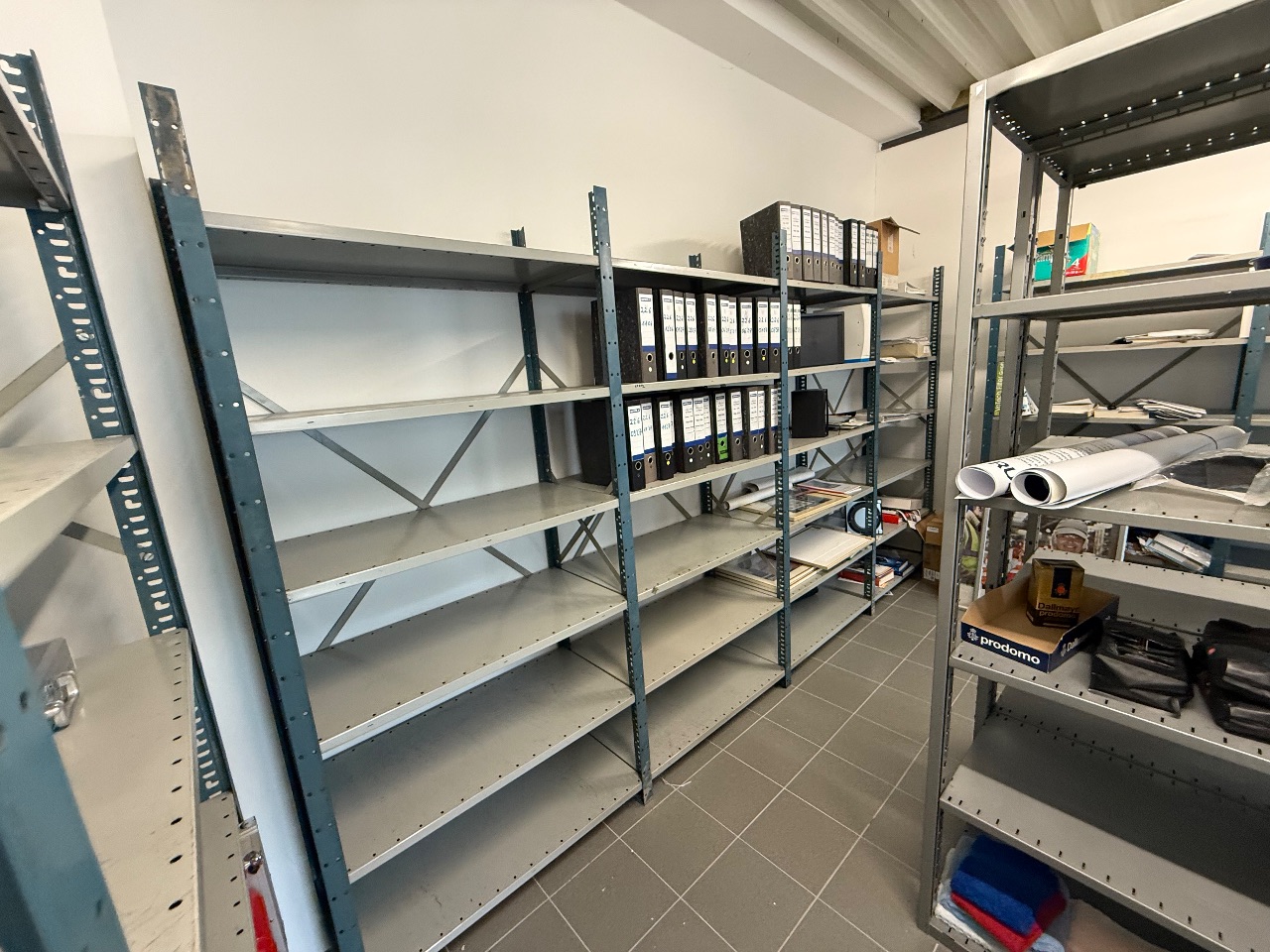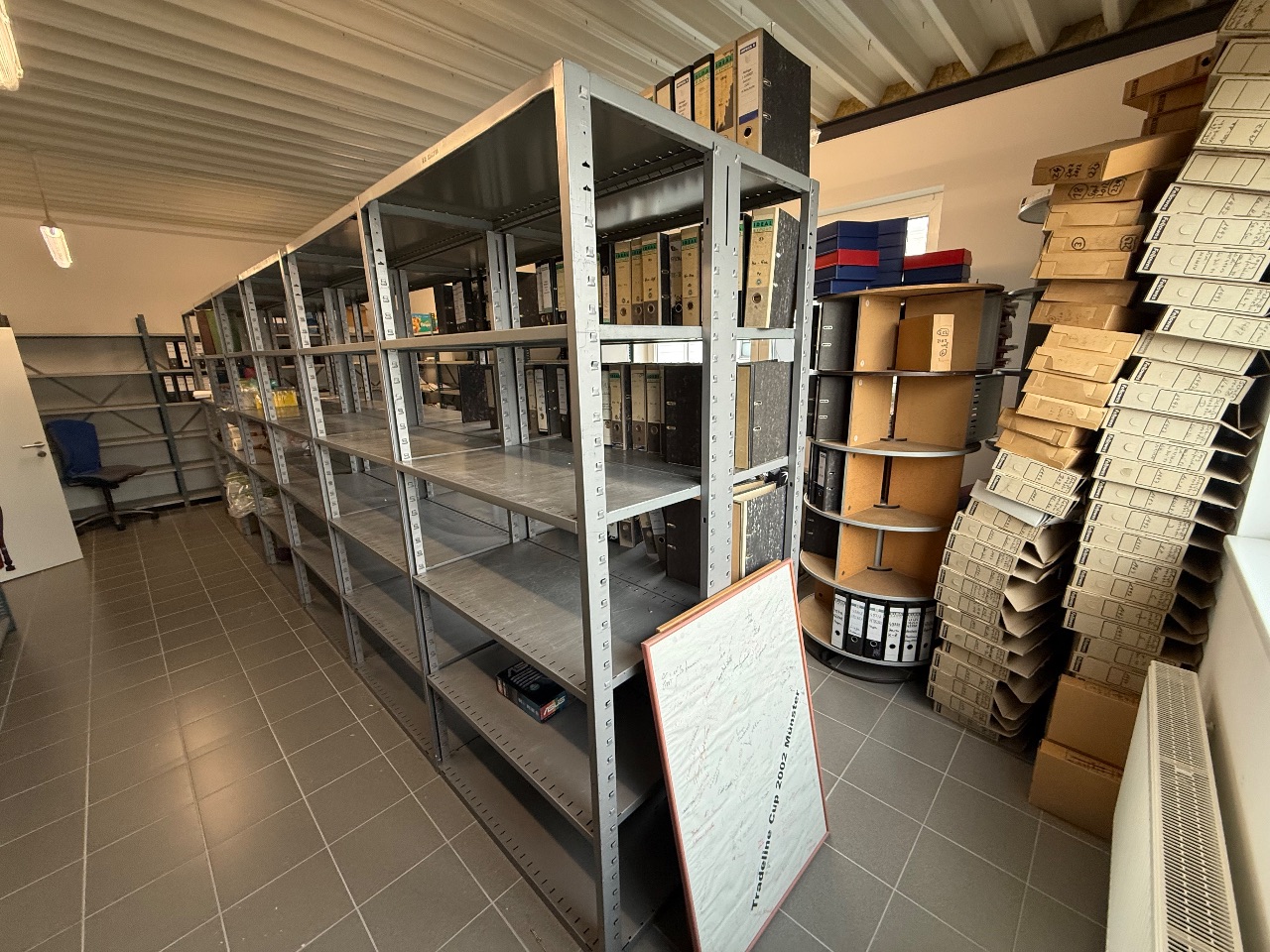 Querrolladenschrank (mit 2 Schrankaufsätzen), 2 Aktenschränke, 2-türig), 2 Metall-Regale (je 1-teilig), 4 Aktenschränke (je 2-türig) 1 Metall-Regal, 1 Schrank (1-türig)