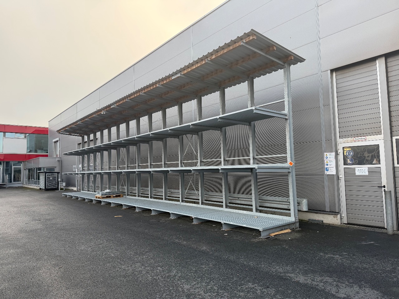 Kragarm-Regal (mit Dachüberstand) - (Robering, Bj.: 2022) - (15 Ständer, je 3 Kragarme) - (Ständerhöhe: 440 cm) - (Ständer-Abstand: 125 cm) - (mit Gitter-Ablageböden) - (Details im Langtext)