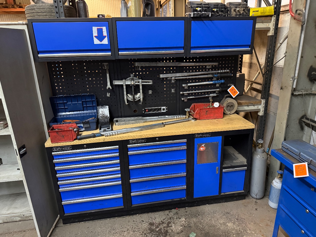 Werkbank mit Unterbauten + Rückwand (mit div. umfangreichen Werkzeugen)