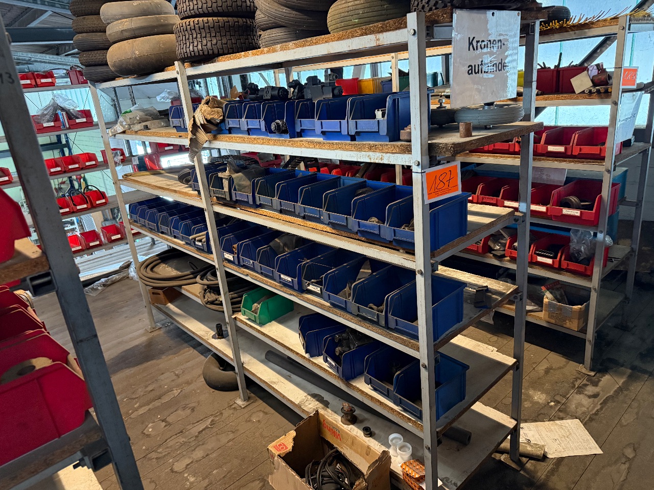 Eisen-Regal (mit Holz-Ablageböden) + (div. Ersatzteilen Agromec) - (div. Werkzeuge, Motoren etc.)