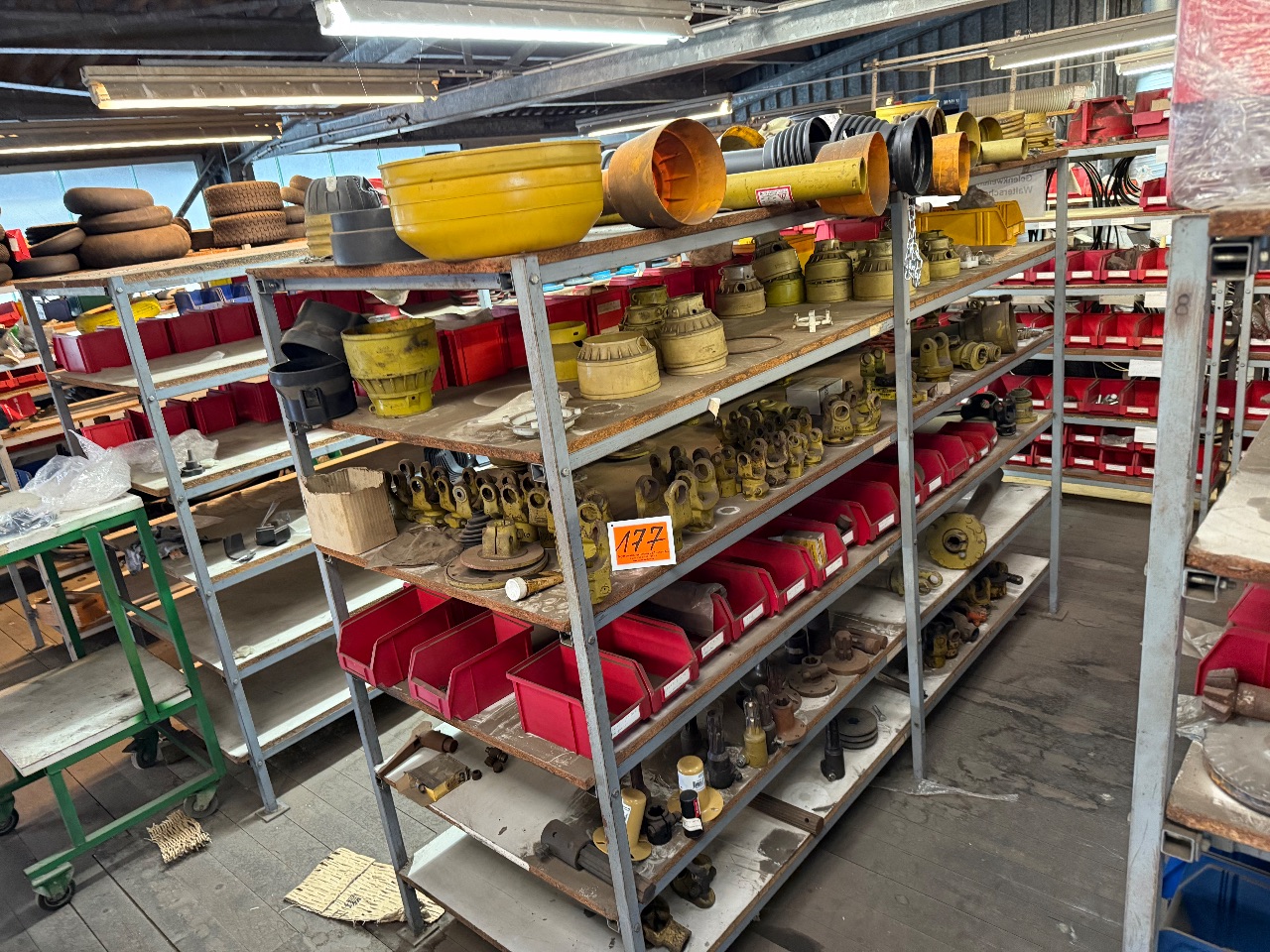 Eisen-Regal (mit Holz-Ablageböden) + (div. Hackscharen + Fräsmessern) + (div. Ersatzteilen Spatenmaschinen - (Gramegna, Falc + Selvatici))